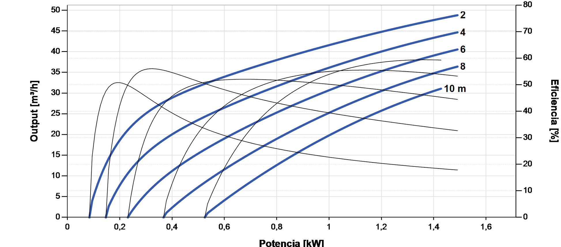 - Maximum flow rate: 49 m³/h and maximum head: 10 m (6” wells).