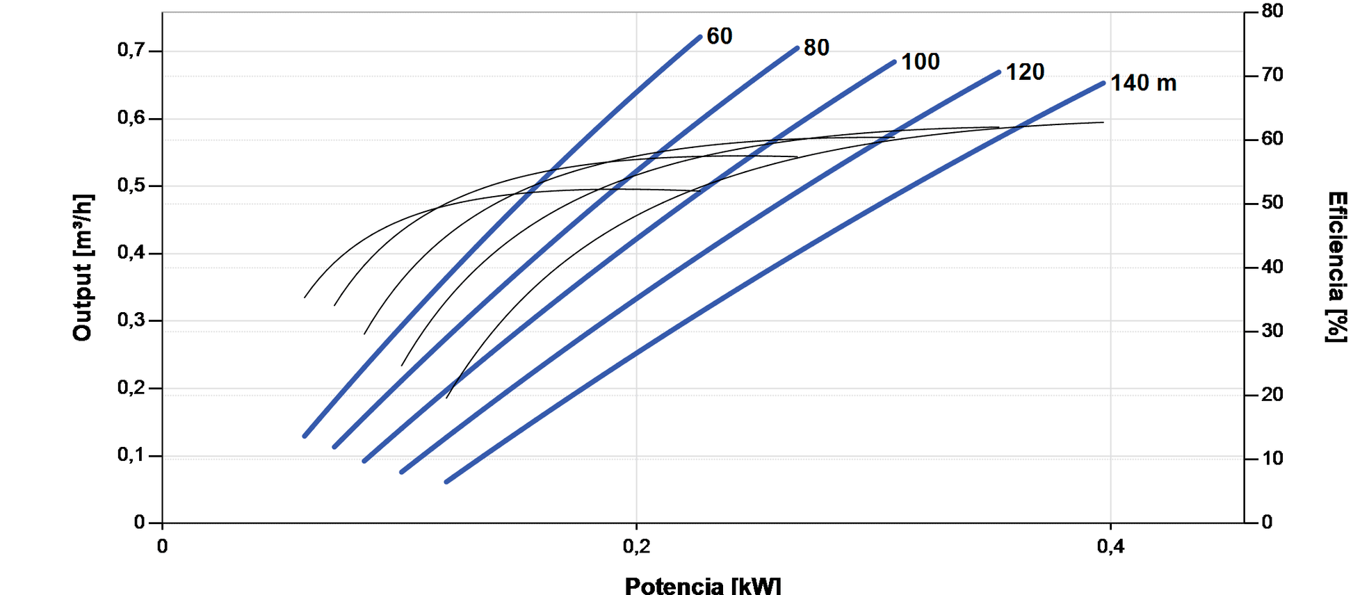 - Maximum reference head of 140 m and flow rate up to 0.72 m³/h (deep wells).