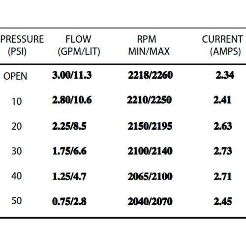- Flow rate: 11.3 l/min (3.0 GPM) at open discharge; stable flow at medium pressures.