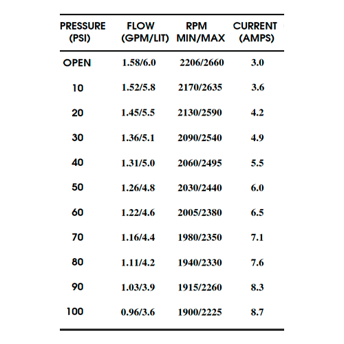 - Self-priming: up to 3.0 m (10 ft) vertical; maximum inlet pressure 2.1 bar (30 PSI).